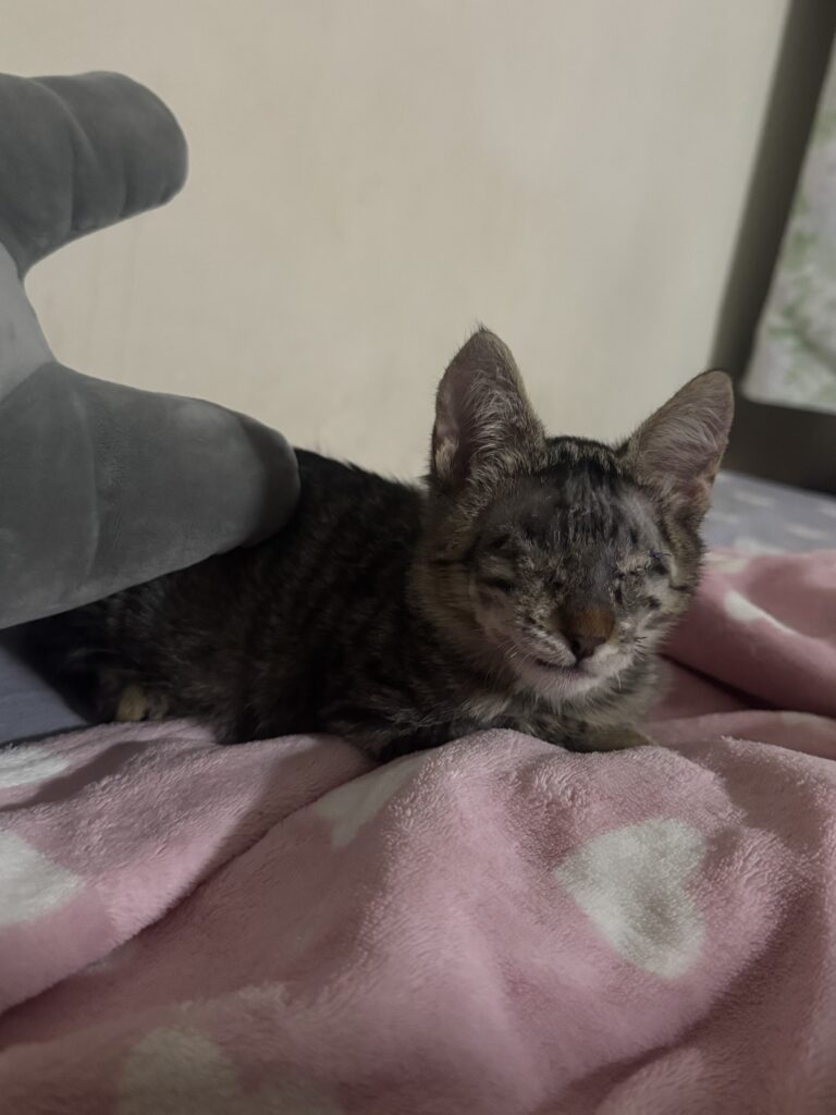 Miranda stayed at the veterinary clinic for a few nights. At first, her eyes didn’t show any obvious sings of infection, and everything seemed stable. The vets cleaned her, bathed her, and helped her regain strength. Once she seemed more alive and responsive, we were able to bring her home. However, not long after arriving at our house, her condition suddenly changed. Her eyes became extremely swollen and infected, to the point where they began to bulge outward. It was painful to see, and it quickly became clear that she couldn’t see at all. She was only around two to three months old, and the situation was very serious.